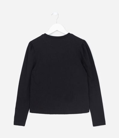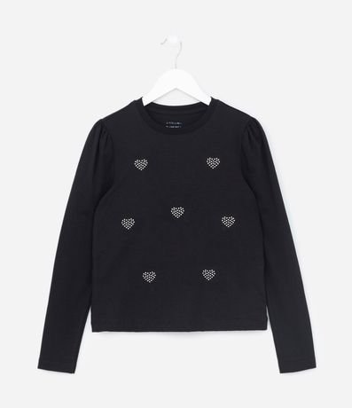 Camiseta infantil confeccionada em algodão, com gola redonda, manga longa e aplicações de brilhinhos em formato de coração.