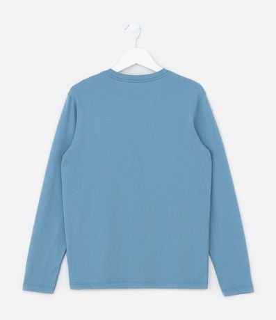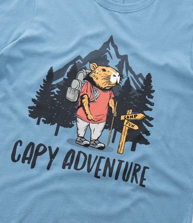 Ref: Camiseta infantil com gola redonda, mangas longas e estampa de capivara com lettering "Capy adventure". A peça é confeccionada com boas práticas ambientais e algodão certificado bci.