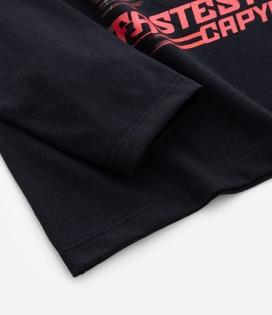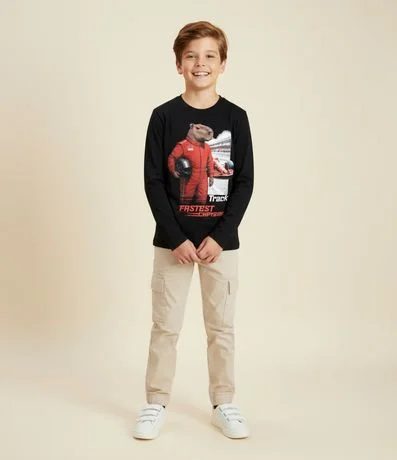 Ref: Camiseta infantil confeccionada em algodão certificado BCI, com gola redonda, mangas longas e estampa localizada inspirada em corrida, trazendo capivara piloto e carro de alta velocidade. Possui toque macio, caimento confortável.