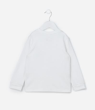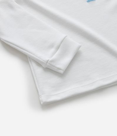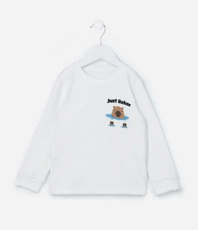 Camiseta infantil confeccionada em algodão, com gola redonda, manga longa e estampa de capivarinha com lettering "Just relax".