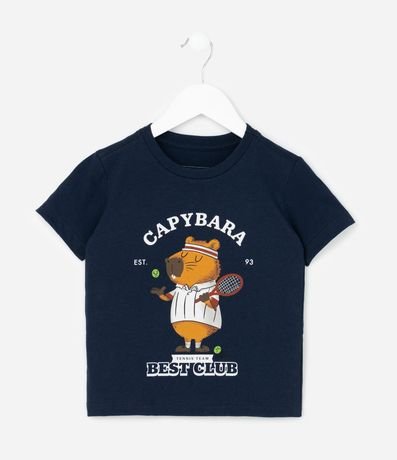 Ref: Camiseta infantil com gola redonda, mangas curtas e estampa de capivara tenista com lettering "Capybara Best Club". A peça é confeccionada com boas práticas ambientais e algodão certificado bci.