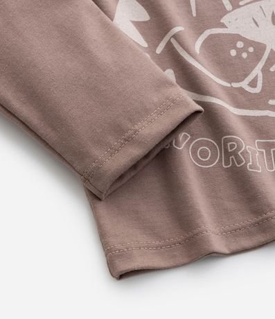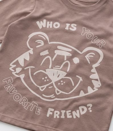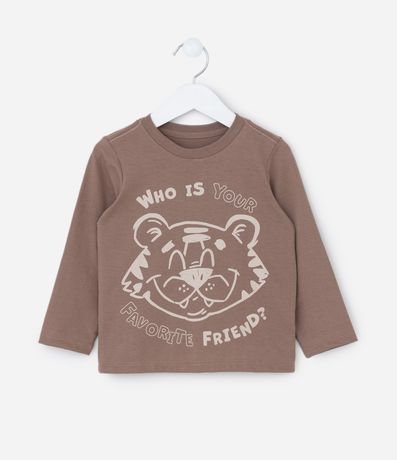 Ref: Camisetinha infantil com gola redonda, manga longa e estampa fofa de carinha de tigrinho. O item é confeccionado com boas práticas ambientais e material pet reciclado, mais sustentável.