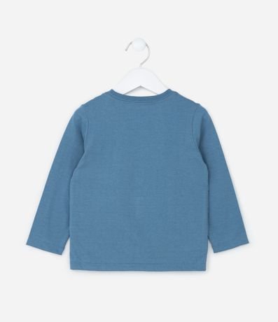 Ref: Camiseta infantil com gola redonda, mangas longas e estampa de carro de corrida. Peça confeccionada em material pet reciclado e com processo de boas práticas ambientais.