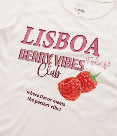 Ref: Camiseta infantil com gola redonda, mangas curtas e estampa de cerejinhas com lettering "Lisboa berry vibes". O item é confeccionado com boas práticas ambientais e algodão certificado bci.