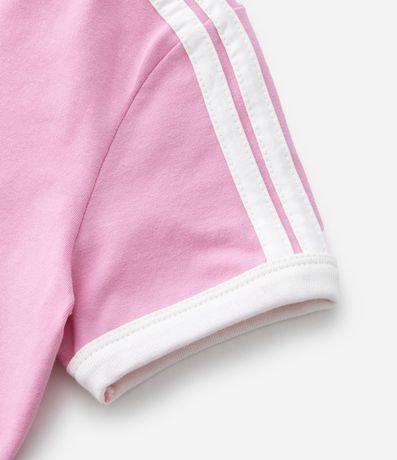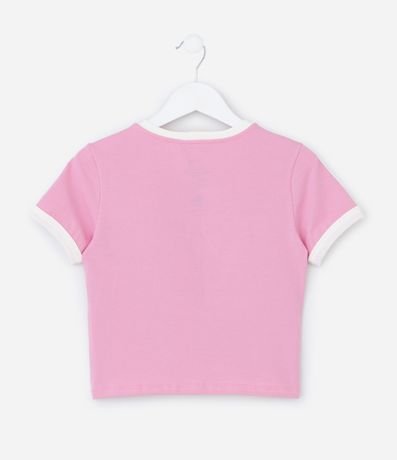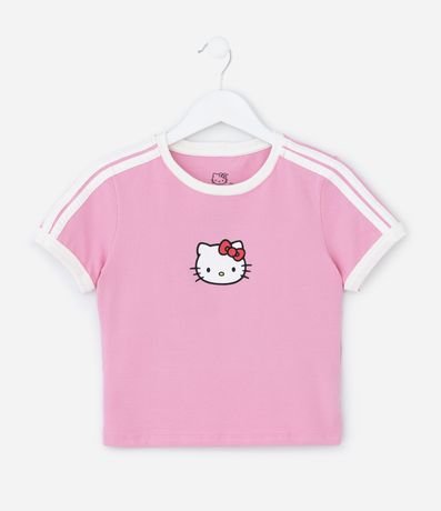 Ref: Camiseta infantil com gola redonda, mangas curtas, listras nos ombros e estampa da Hello Kitty no peito. A peça é confeccionada com boas práticas ambientais e material pet reciclado.