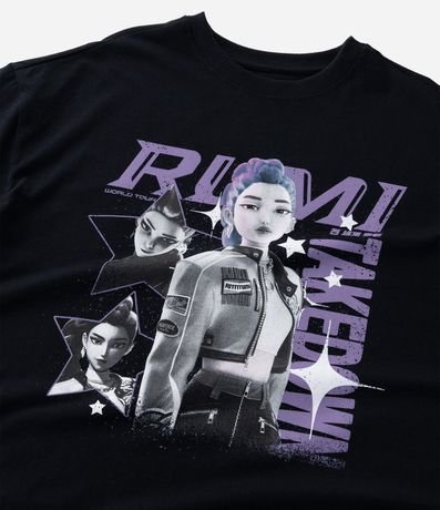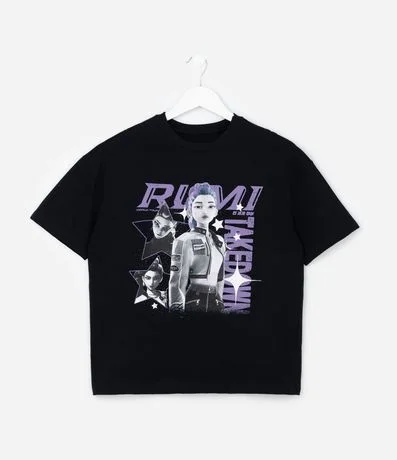 Ref: Camiseta infantil confeccionada em algodão certificado BCI e boas práticas ambientais, apresentando estampa da personagem Rumi de K-POP Demon Hunters, com modelagem over e gola redonda, garantindo conforto, caimento moderno e estilo.