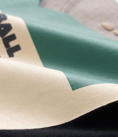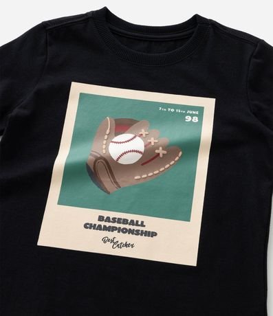 Camiseta infantil confeccionada em algodão mais sustentável através de boas práticas ambientais. Possui gola redonda, manga curta e estampa de baseball.