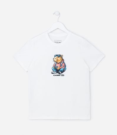 Ref: Camiseta infantil em meia malha, com golinha redonda, manga curta e estampa frontal divertida de capivara jogando video game.