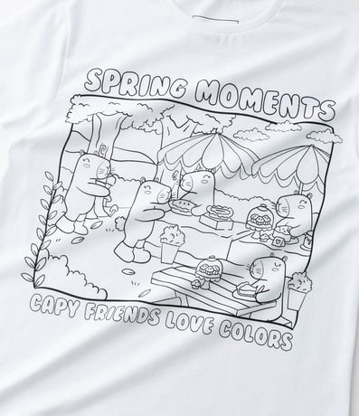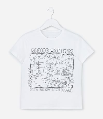Ref: Camiseta infantil confeccionada em algodão mais sustentável através de boas práticas ambientais, no modelo regular. Possui gola redonda, manga curta e estampa de capivara para colorir. Não acompanha canetinhas.