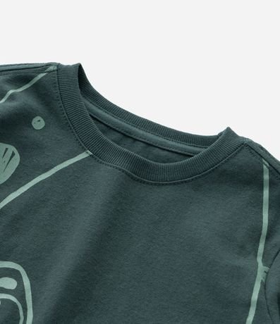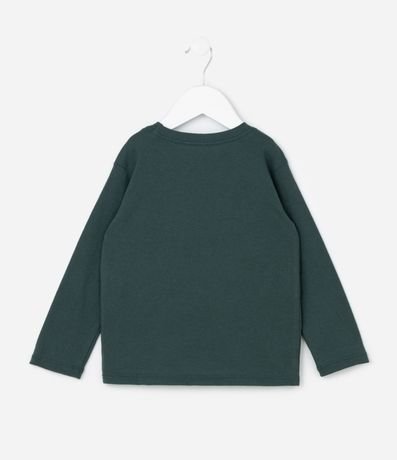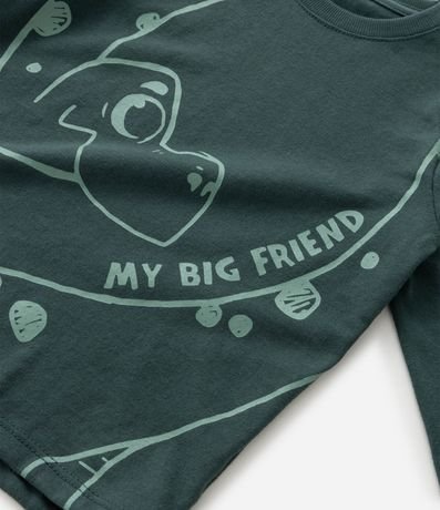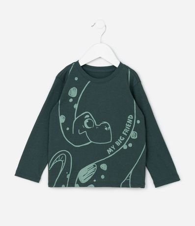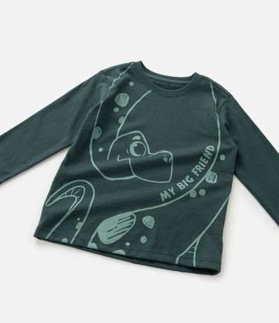 Ref: Camiseta infantil confeccionada em algodão mais sustentável através de boas práticas ambientais. Possui gola redonda, manga longa e estampa de dinossauro.