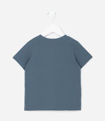 Camiseta infantil confeccionada em algodão certificado BCI e boas práticas ambientais, oferecendo toque macio e conforto. Possui gola redonda, mangas curtas e estampa de dinossauros no peito, trazendo um visual divertido.