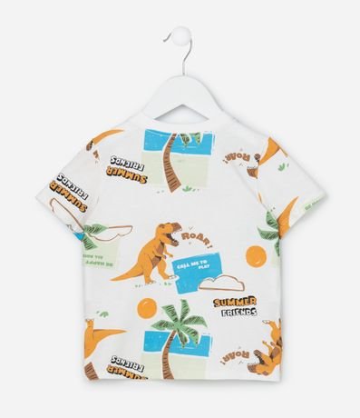 Ref: Camiseta infantil confeccionada em algodão de material mais sustentável. Possui gola redonda, mangas curtas e estampa de dinossauros e coqueiros.