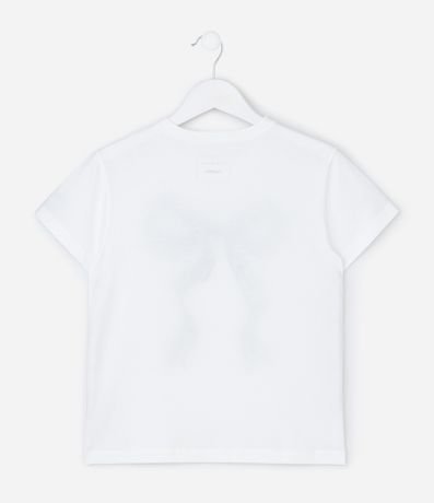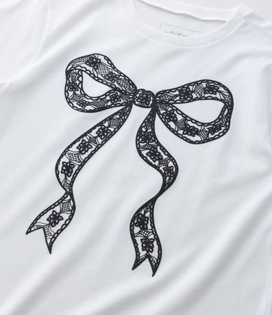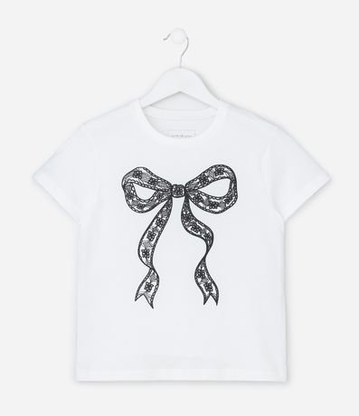 Ref: Camiseta infantil confeccionada em algodão certificado BCI, com gola redonda e mangas curtas. Possui estampa localizada em puff com efeito de renda formando um laço delicado, criando visual moderno e elegante para compor looks casuais confortáveis no dia a dia.