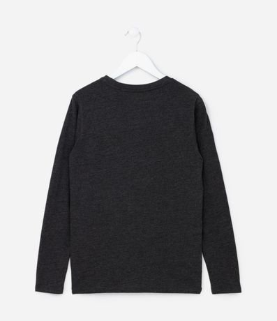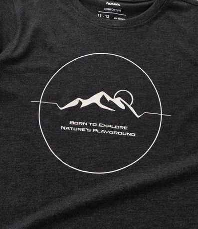 Ref: Camiseta infantil confeccionada malha de algodão e poliéster, com gola redonda e mangas longas. Possui estampa frontal de montanha, com lettering "born to explore nature's playground" e fundo liso mescla.