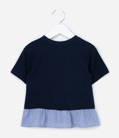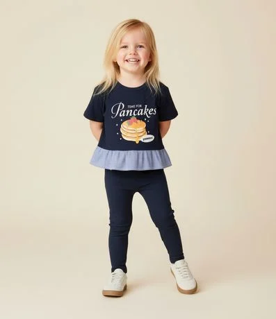 Blusa infantil confeccionada em malha malhão, de modelo comfy, com gola redonda e mangas curtas. Possui estampa frontal de panquecas e barra franzidinha em tricoline.