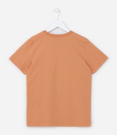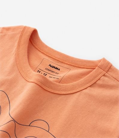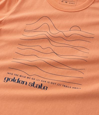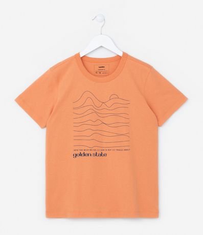 Ref: Camiseta infantil em algodão, com golinha redonda, manga curta e estampa frontal de pôr do sol com ondas em listras.