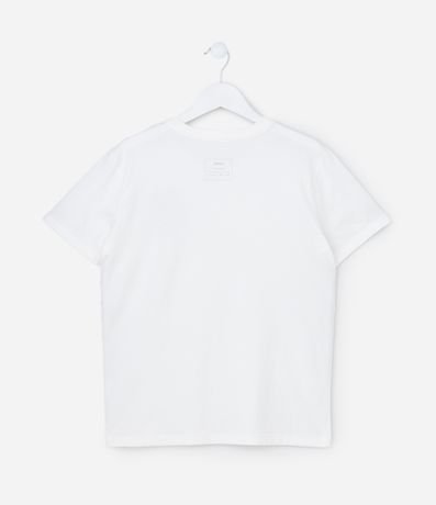 Ref: Camiseta infantil confeccionada em algodão de material e processo mais sustentáveis. Possui gola redonda, manga curta e estampa praia com lettering "Living in the moment".