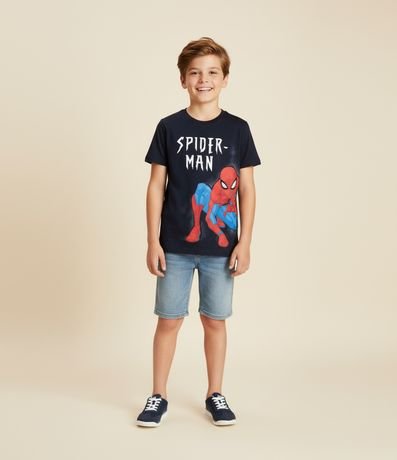Ref: Camiseta infantil confeccionada em algodão de material e processo mais sustentáveis. Possui gola redonda, manga curta e estampa do Homem-Aranha, com lettering Spider Man.