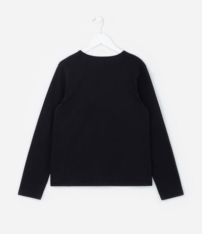 Camiseta infantil com gola redonda, mangas longas e estampa de doodles grafitados. A peça é confeccionada com boas práticas ambientais e algodão certificado bci mais sustentável.