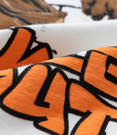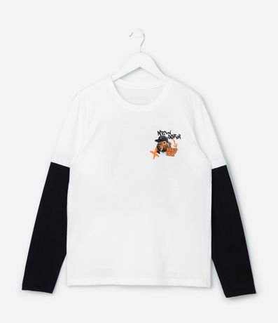 Ref: Camiseta infantil confeccionada com material e práticas mais sustentáveis. Possui gola redonda, manga longa contrastante e estampa frente e costas de capivara skatista.