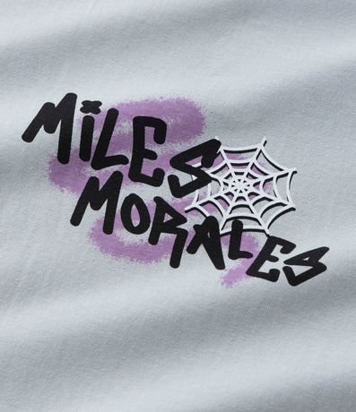 Ref: Camiseta infantil com gola redonda, mangas curtas e estampa frente e costas do Homem-Aranha, de Miles Morales com letras que imitam grafites. A peça é confeccionada com boas práticas ambientais e algodão certificado bci.