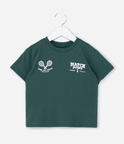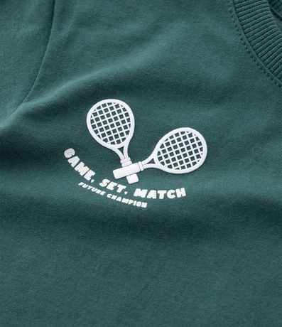Ref: Camiseta infantil confeccionada em algodão mais sustentável. Possui gola redonda, manga curta e estampa frente e costas de raquetes de tenis, com lettering.