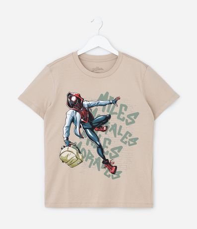 Ref: Camiseta infantil confeccionada com material e processo mais sustentável. Possui gola redonda, mangas curtas e estampa do Homem-Aranha de Miles Morales.