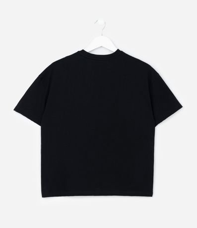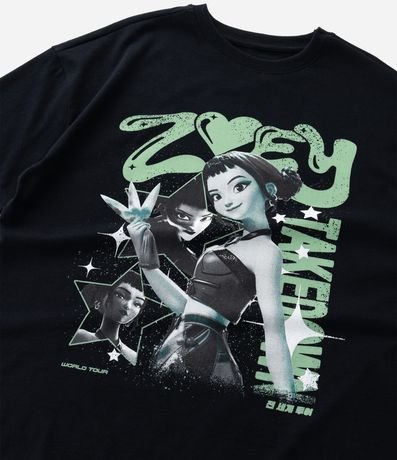 Ref: Camiseta infantil confeccionada em algodão certificado BCI e boas práticas ambientais, trazendo estampa das Huntrix Guerreiras do K-pop, com modelagem over e gola redonda.
