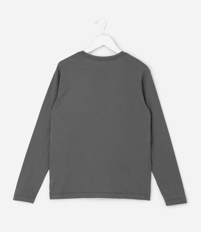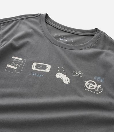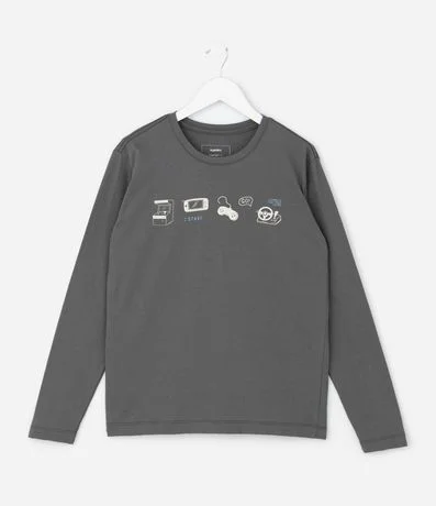 Ref: Camiseta infantil modelo comfort, confeccionada em algodão certificado BCI, com gola redonda e mangas longas. Possui estampa localizada com ícones gamer estilizados.