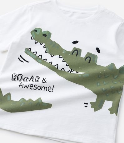 Ref: Camiseta infantil confeccionada com material e processo mais sustentável. Possui gola redonda, mangas e estampa de jacarézinho com lettering "Roaar".