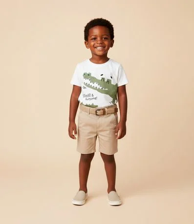 Ref: Camiseta infantil confeccionada com material e processo mais sustentável. Possui gola redonda, mangas e estampa de jacarézinho com lettering "Roaar".