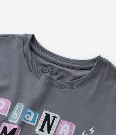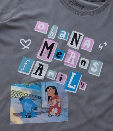 Camiseta infantil confeccionada em algodão mais responsável, com mangas curtas e estampa de Lilo e Stitch, com lettering Ohana Means Family.