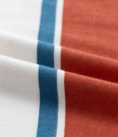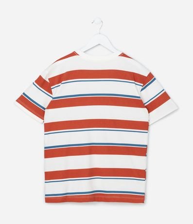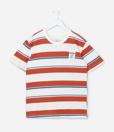 Ref: Camiseta infantil confeccionada em material e processo mais sustentável. Possui gola redonda, mangas curtas, bordado no peito e estampa listrada.