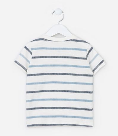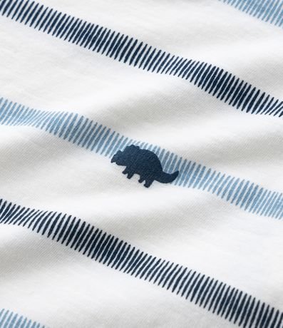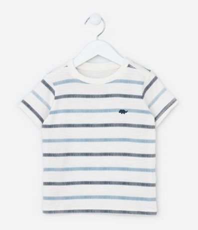 Ref: Camiseta infantil confeccionada em flame de material e processo mais sustentáveis. Possui gola redonda, manga curta e estampa de listras.