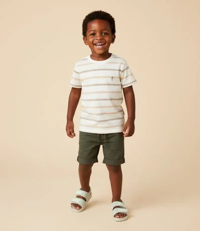 Ref: Camiseta infantil confeccionada em flame de material e processo mais sustentáveis. Possui gola redonda, manga curta e estampa de listras.