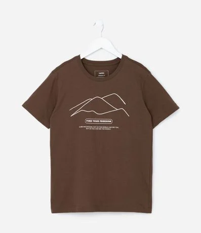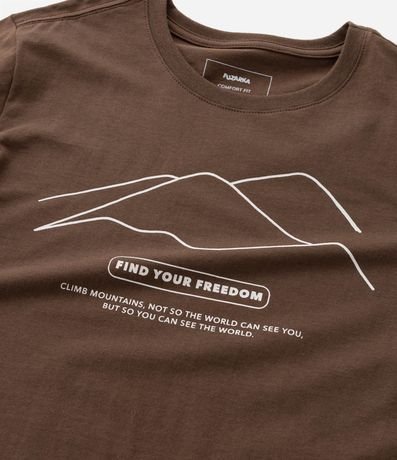 Ref: Camiseta infantil confeccionada em algodão de material e processo mais sustentáveis. Possui gola redonda, manga curta e estampa de montanhas e lettering "Find your freedom".