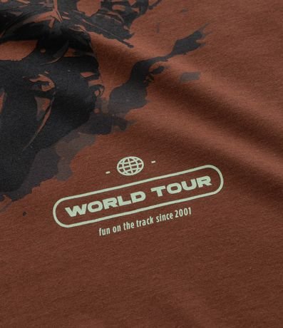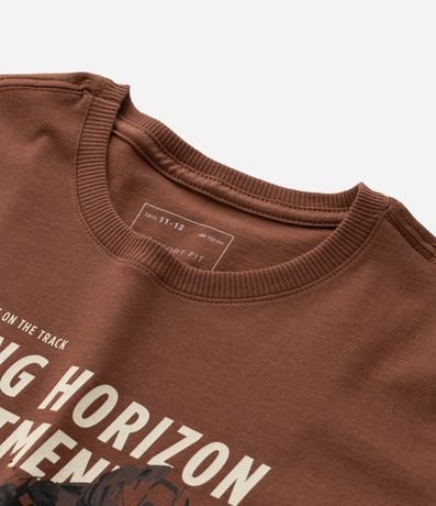 Ref: Camiseta infantil confeccionada em malha de algodão. A blusa tem gola redonda, mangas curtas e estampa de moto.