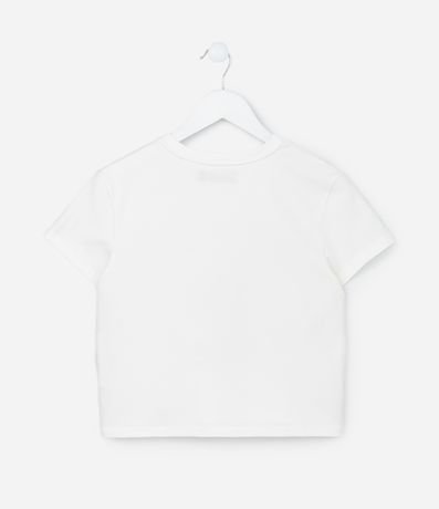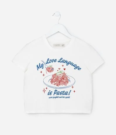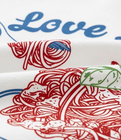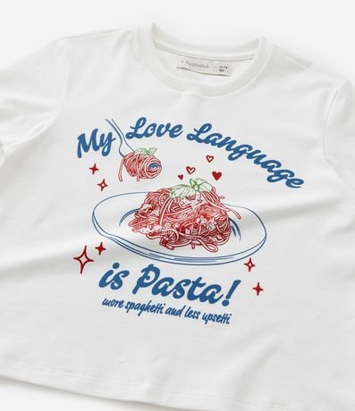 Ref: Camiseta infantil com gola redonda, mangas curtas e estampa de macarrão, com lettering "My love language is pasta". A peça é confeccionada com boas práticas ambientais e algodão certificado bci.