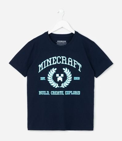 Ref: Camiseta infantil confeccionada em algodão mais sustentável através de boas práticas ambientais, no modelo college. Possui gola redonda, manga curta e estampa neom "Minecrafit".