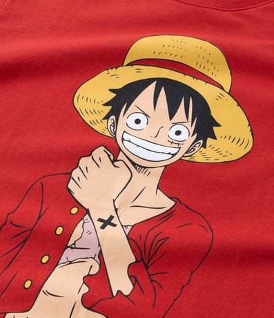 Camiseta infantil com mangas curtas, confeccionada em algodão mais sustentável e estampa frontal, Luffy. Acompanha chapéu de palha.