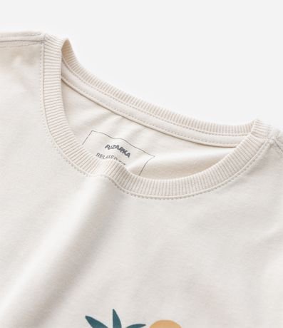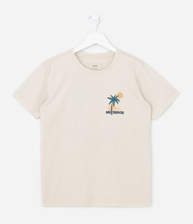 Ref: Camiseta infantil confeccionada em cotton mais sustentável através de boas práticas ambientais, no modelo regular. Possui gola redonda, manga curta e estampa de praia e lettering "País Tropical".
