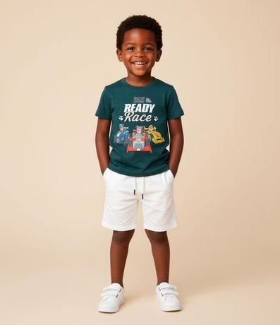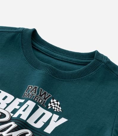 Ref: Camiseta infantil confeccionada com material e processo mais sustentável. Possui gola redonda, mangas curtas e estampa da Patrulha Canina com lettering "Ready race".