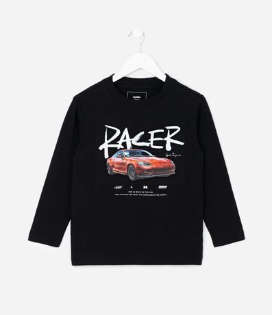 Ref: Camiseta infantil confeccionada em algodão certificado BCI, com toque macio e caimento confortável. Possui gola redonda, mangas longas e estampa localizada com carro esportivo e lettering Racer em efeito embossado, criando visual marcante e moderno para compor looks casuais.