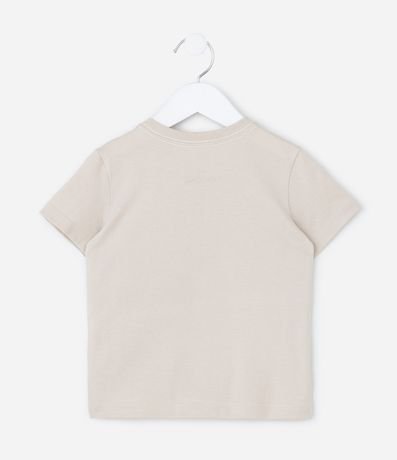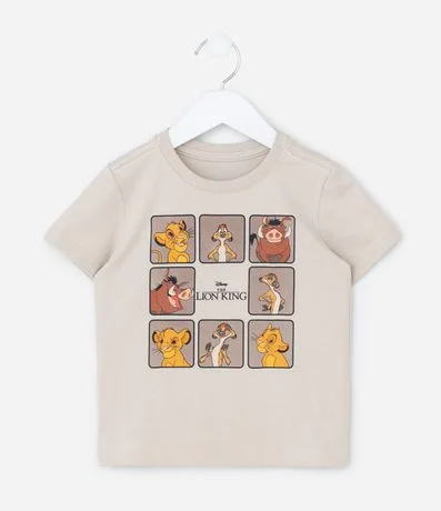 Camiseta infantil confeccionada em algodão de material mais sustentável. Possui gola redonda, manga curta e estampa do filme "O Rei Leão".