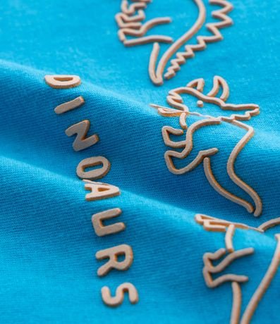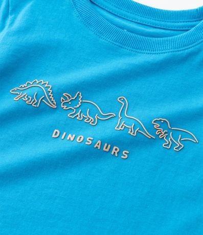 Camiseta infantil confeccionada em algodão de material mais sustentável. Possui gola redonda, mangas curtas e estampa em relevo de dinossauros.