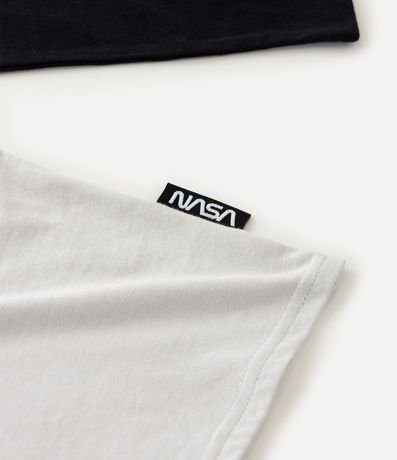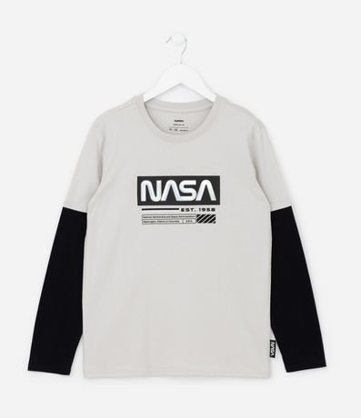 Ref: Camiseta infantil confeccionada em algodão mais sustentável. Possui gola redonda, mangas longas contrastantes e estampa holográfica em relevo da NASA.