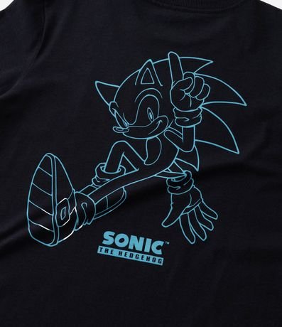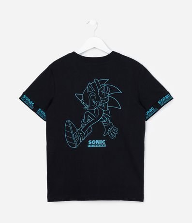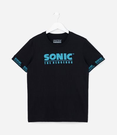 Ref: Camiseta infantil de modelo comfort, confeccionada em algodão, com gola redonda, mangas curtas e estampa do Sonic frente e costas, e lettering nas mangas.