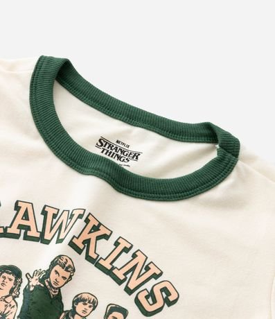 Ref: Camiseta infantil confeccionada em algodão mais sustentável através de boas práticas ambientais. Possui gola redonda, manga curta, estampa e lettering "Stranger Things".