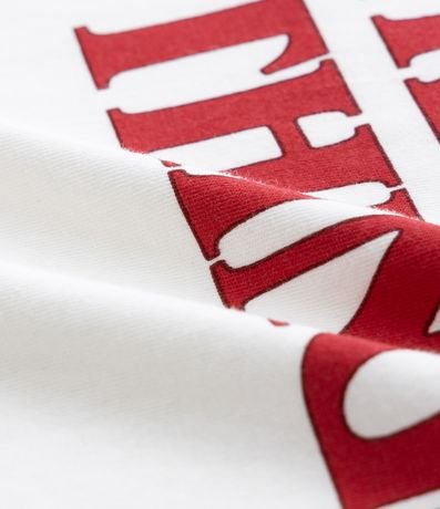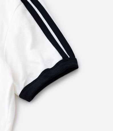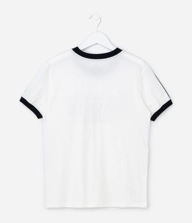 Ref: Camiseta infantil confeccionada em algodão mais sustentável através de boas práticas ambientais. Possui gola redonda, manga curta, com listras e viés contrastantes e estampa lettering "Stranger Things".