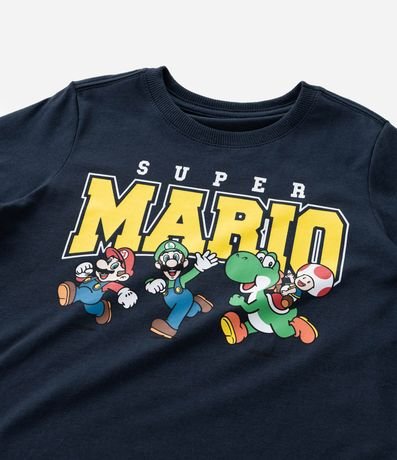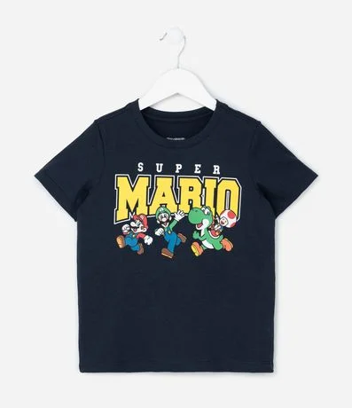 Ref: Camiseta infantil confeccionada em algodão de material e processo mais sustentáveis. Possui gola redonda, manga curta e estampa do Super Mario.